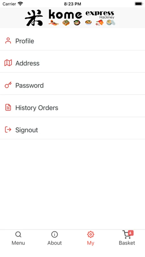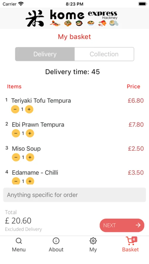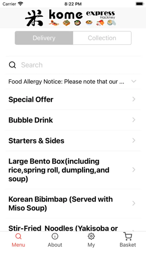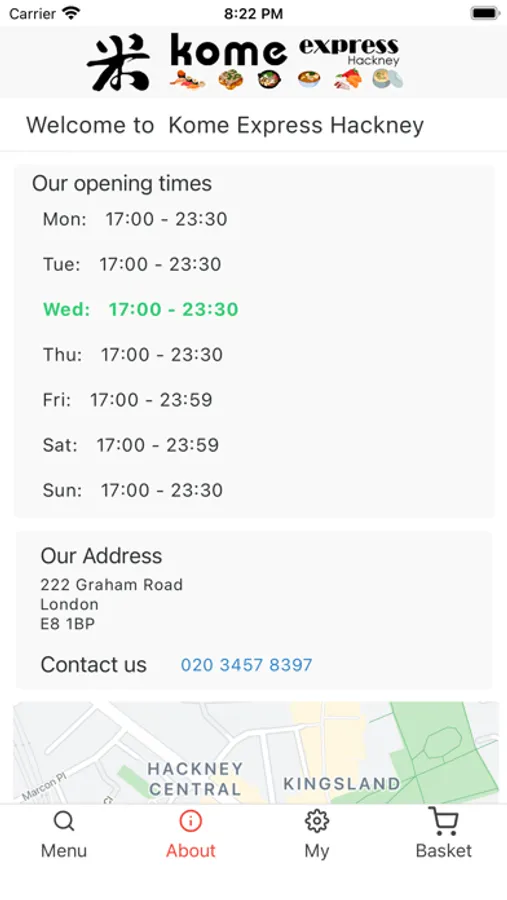 You can place delivery/collection orders via Kome Express Hackney APP.
