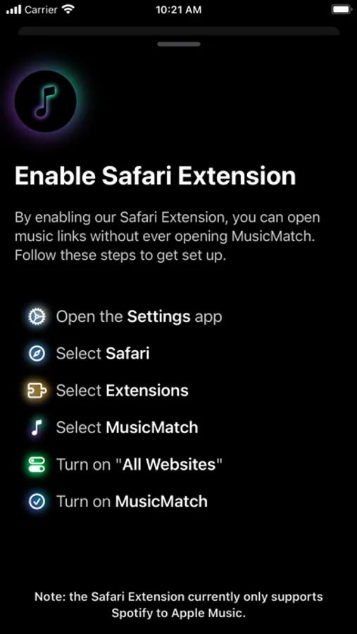 With the MusicMatch Safari Extension, you can open music links without ever opening the MusicMatch app. To get set up, follow the in-app instructions.
