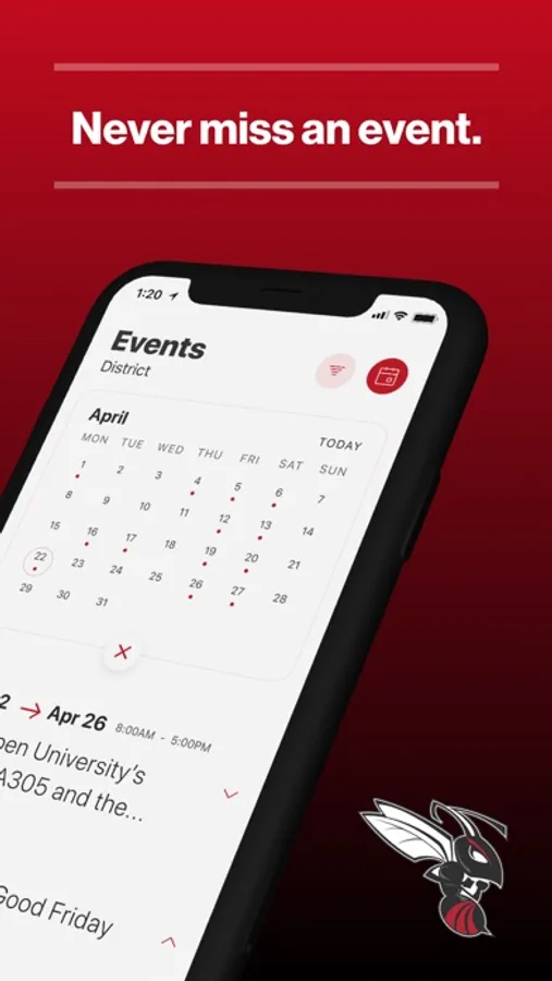 The event section shows a list of events throughout the district. Users can add an event to their calendar to share the event with friends and family with one tap.