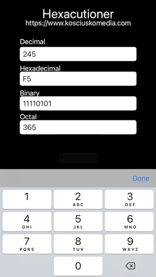 Hexacutioner is a simple, light-weight decimal to hexadecimal, binary, octal converter. You can start with any number system you choose and it will automatically convert to the other number systems.