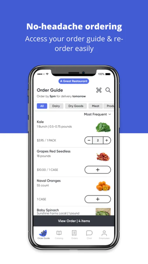 Our mobile app lets you search our complete product catalog, manage and update your ordering guide, and buy what you need at the moment you need it. It’s part of our commitment to giving you an ordering experience you’ll love.