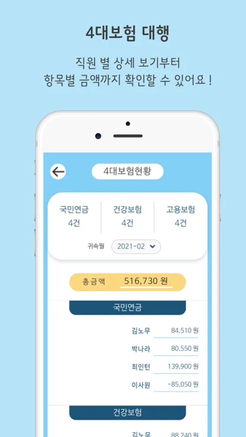 급여명세서, 4대보험, 지원금, 연차현황, 각종 인사노무서식,