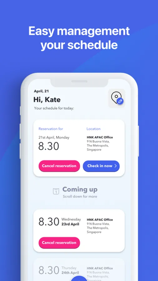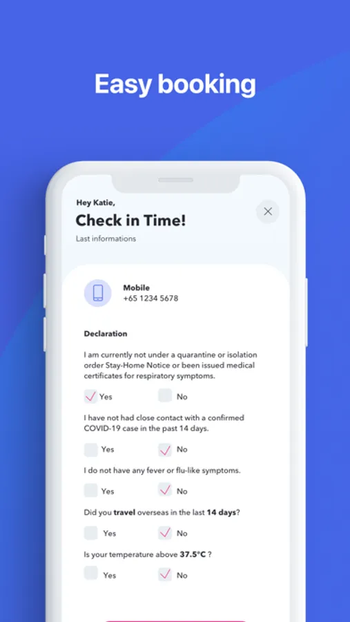 The app is used for reserve the space in the office in advance, manage capacity of the day, do the medical declaration twice a day, notify user to check in and go to work 1 day before on boarding