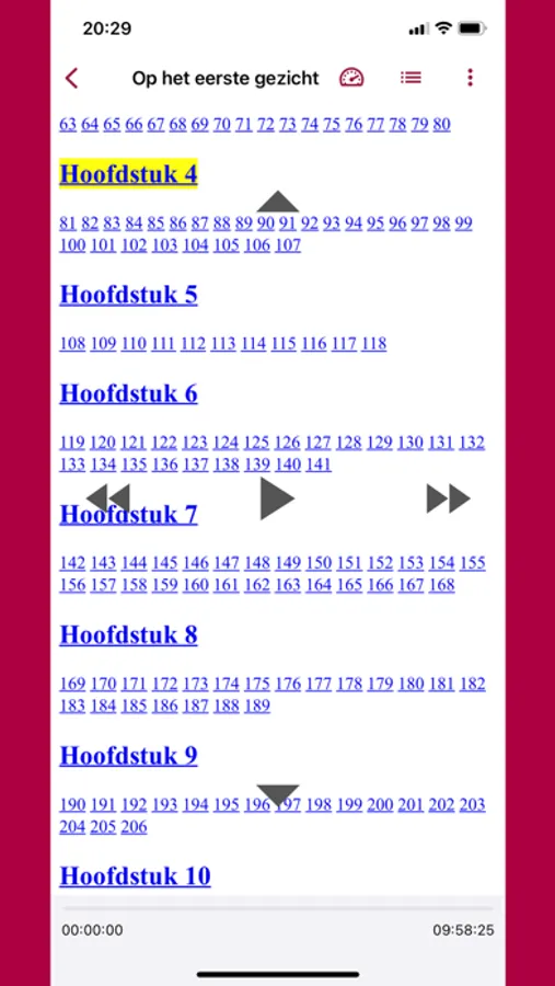 De Passend Lezen-app ondersteunt de verschillende navigatiemogelijkheden volgens de Daisy-standaard, zoals verder luisteren vanaf het volgende of vorige hoofdstuk en springen naar de volgende of vorige pagina indien deze navigatieniveaus beschikbaar zijn. Ook kunt u vanuit de inhoudsopgave direct naar een hoofdstuk, rubriek of pagina springen.