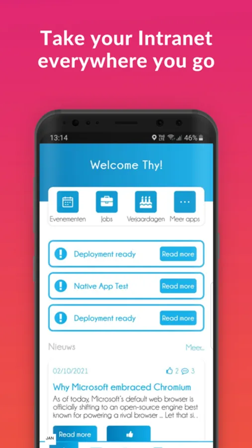 Through the More tab you get access to your specific app configured links in your Intranet solution. Enable push notifications to get