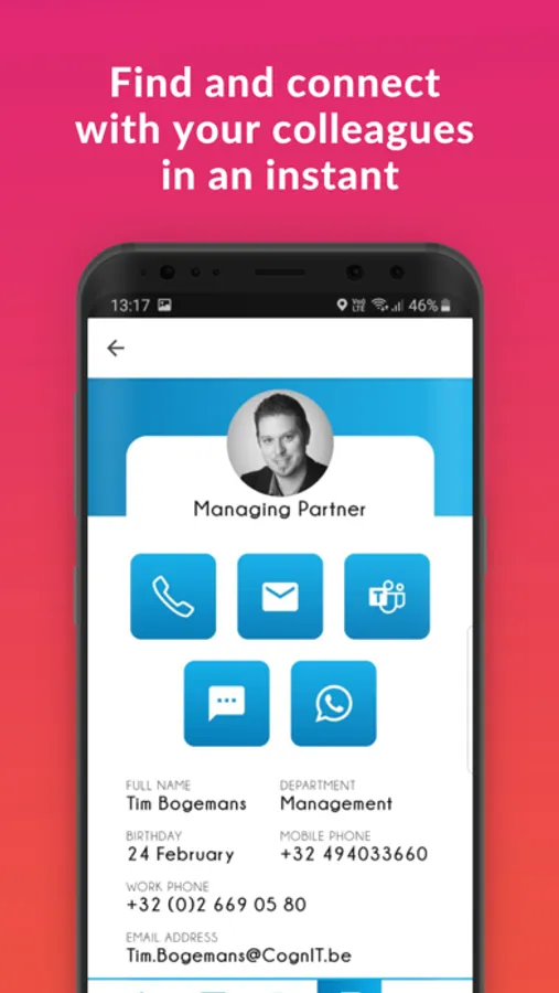 Connect to an employee through Teams, WhatsApp, SMS or call in just one touch.