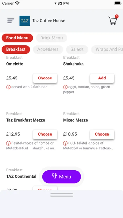 We are going to be serving the various selections of coffees along with oriental tea and coffee as the house special, breakfast, appetisers, salads, wraps and panini, Manakish- which is a flat hand made- oven cooked pastry, soup, fatayer which is similar to the Manakish in essence but the shape and filling is slightly differs, Oriantal desserts, cakes and finally Taz coffee house specialties
