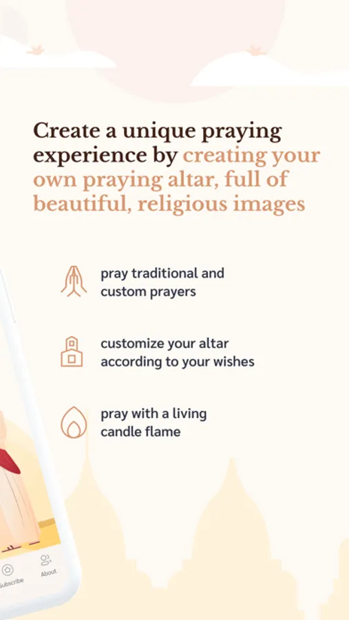 Simply download this app, pick your religion, create and customize your own praying altar, choose between traditional and custom prayers, and create a warm, welcoming place where you meet with God in prayer!