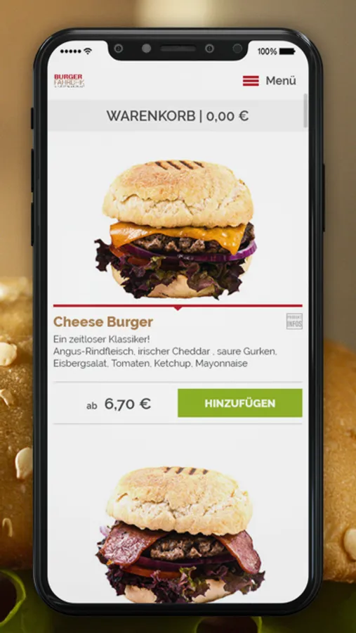 Laden Sie jetzt die neue Burgerfahrbrik App herunter und überzeugen Sie sich von unseren Burgern, Bowls, Wraps, Salaten und mehr!