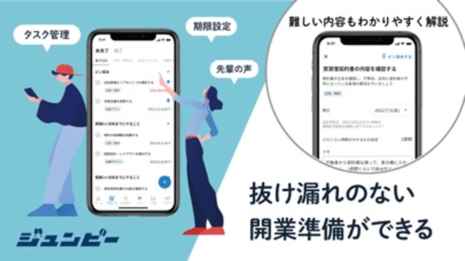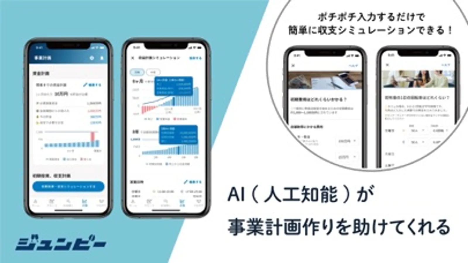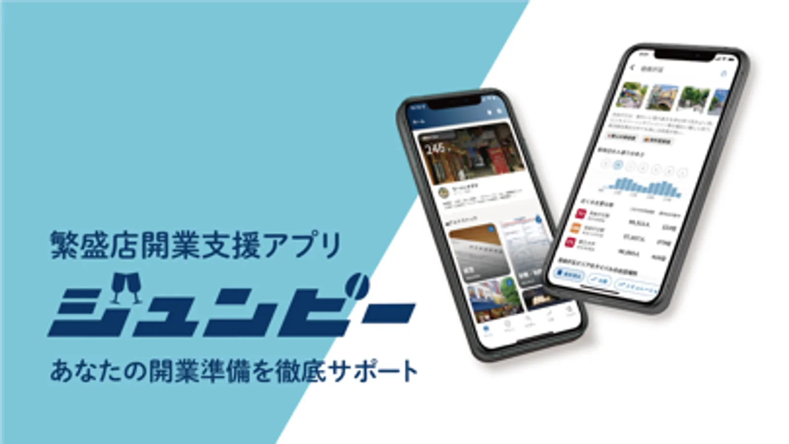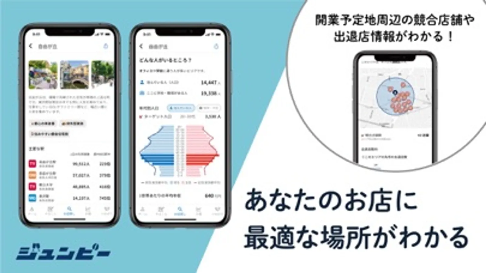 ジュンビーは、開業を考えている全ての方に無料で使っていただける出店サポートアプリです。誰もが難しいリサーチ・分析をすることなく出店準備の課題を解決し、勘に頼らない・失敗しない出店場所選びができます。