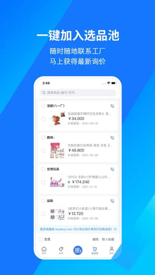 将商品加入选品池,商品会自动向工厂询新价格,同时还可获取工厂联系方式。