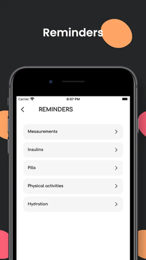 →Measurements, Insulin doses, Medicine, Physical activities, Hydration reminders.