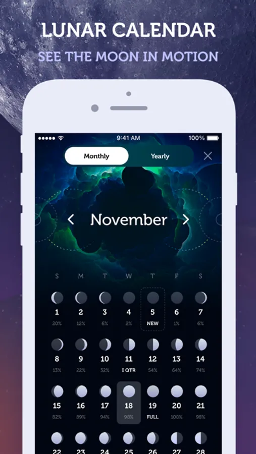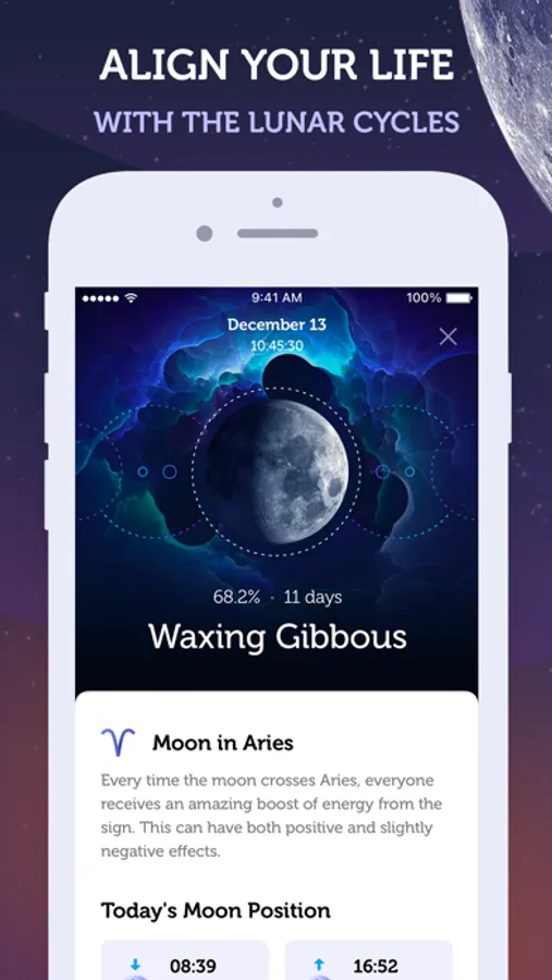 Moon Shine is a universal lunar calendar that shows the current moon cycle, moon age, moonrise & moonset times, and extras such as meditations and sleep sounds to help relax and unwind before bed. The necessary information can be viewed on a specific date and time and at a particular location. There is no need to stare at it with a telescope - Moon Shine is your personal lunar forecast in your pocket!