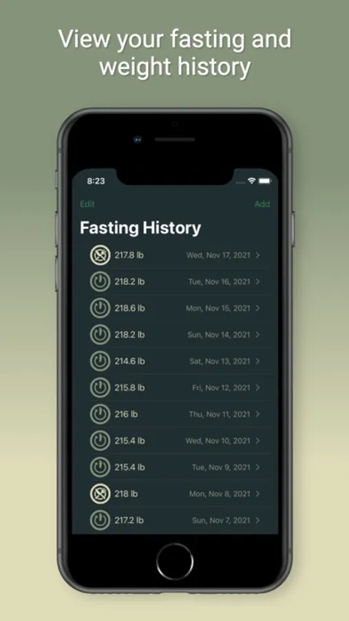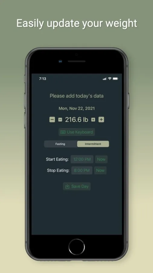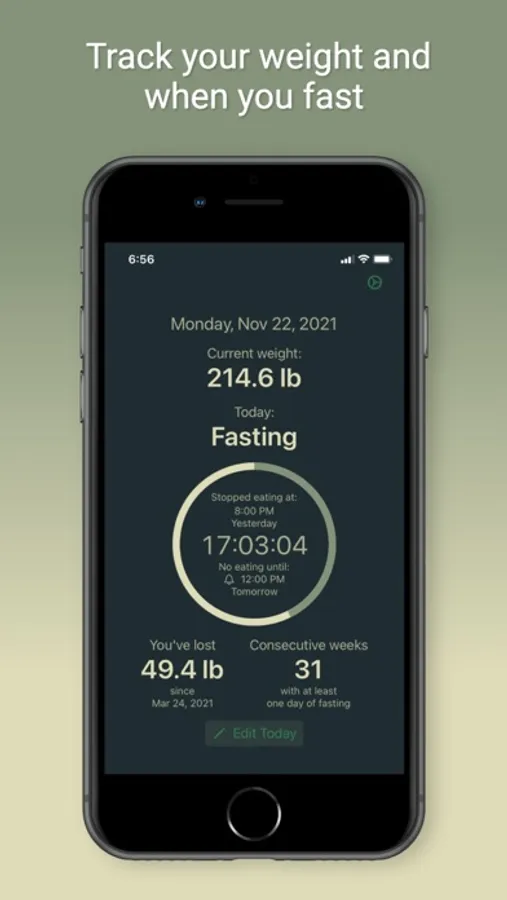 Fasty: the Fasting Tracker helps you track your weight, the days you fast, and when you eat on non-fasting days (intermittent fasting).