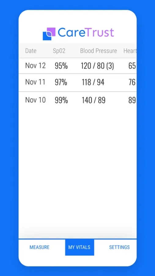 CareTrust is a remote patient monitoring service that allows monitoring your vitals from the comfort of your home.To collect your vitals, the CareTrust app works with compatible FDA-cleared monitoring devices.