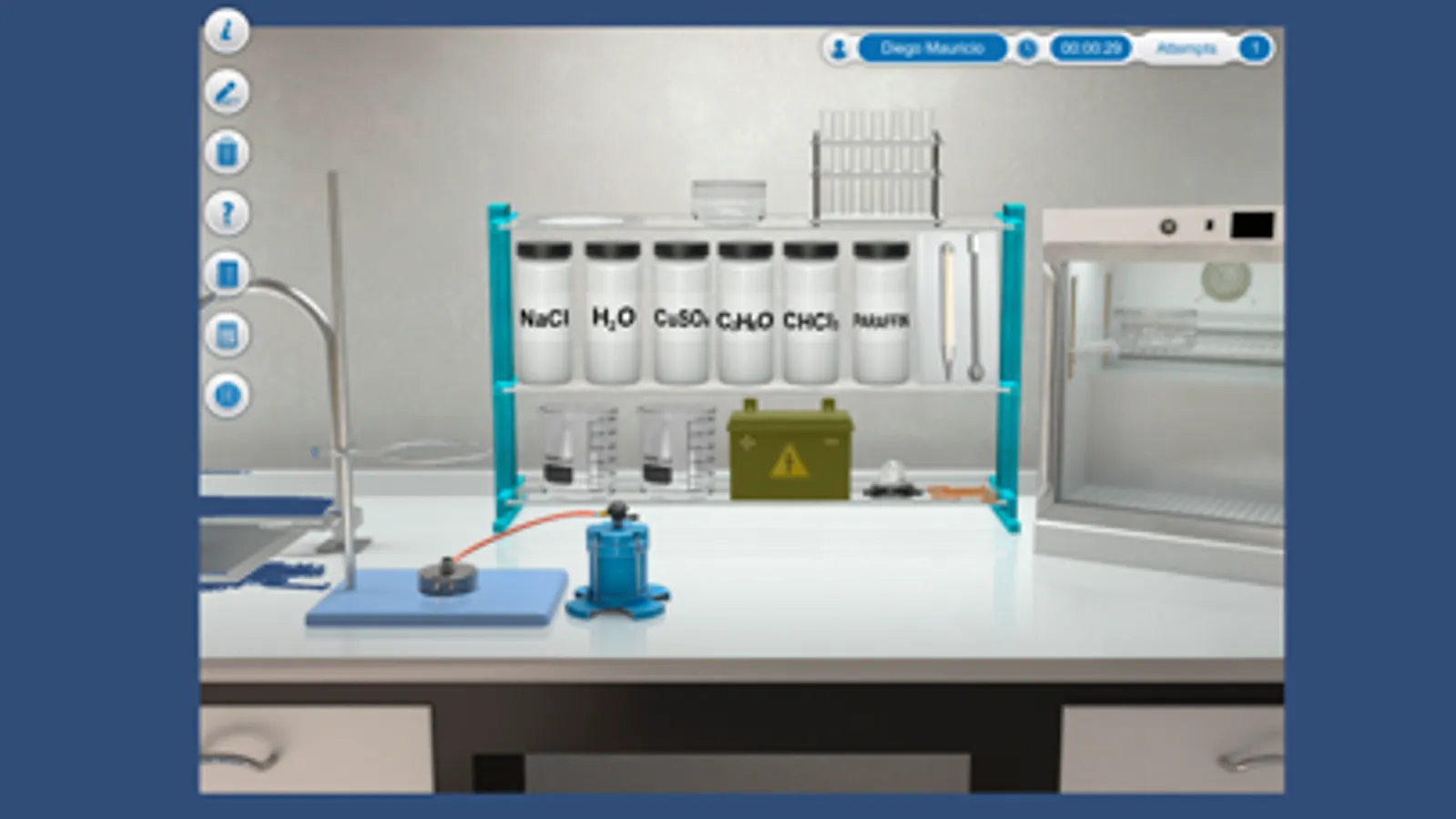 In this practice, tests of electrical conductivity, melting point and solubility must be carried out to classify five reagents and characterize them by means of the type of bond. The simulator recreates a chemistry laboratory with sodium chloride, water, copper sulfate, chloroform, paraffin, a battery, a light bulb, a crystallizer, a refrigerator, and a thermometer, among other necessary elements.