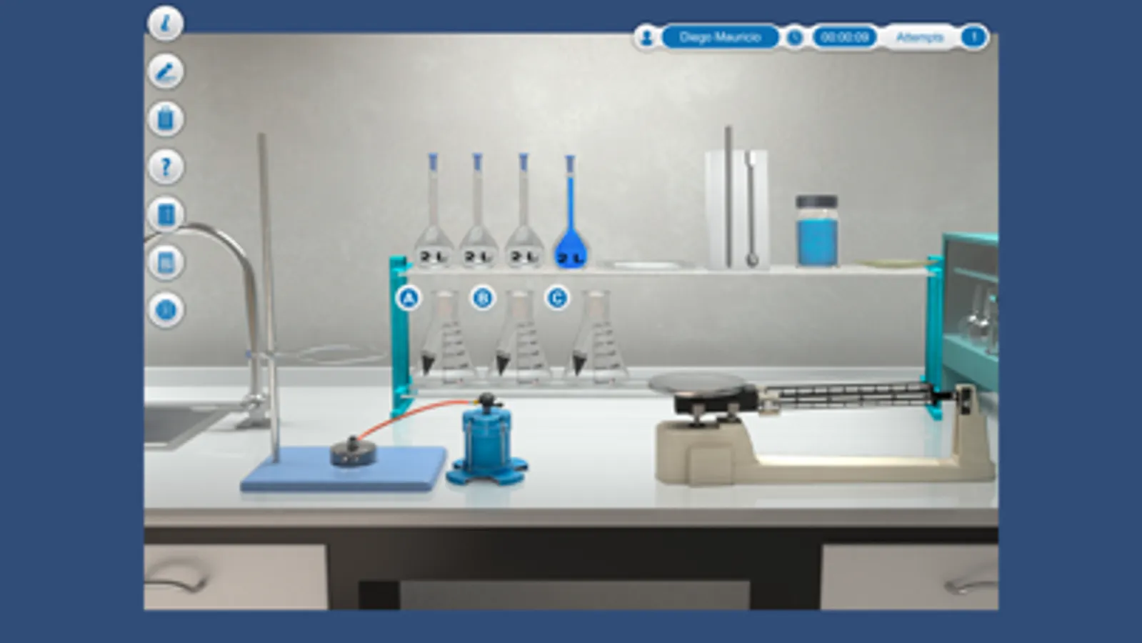 This simulator recreates a laboratory with an Erlenmeyer flask, a burette, a stirring plate and a pH meter. The objective of this practice is to titrate an acid by potentiometric method and characterize it.