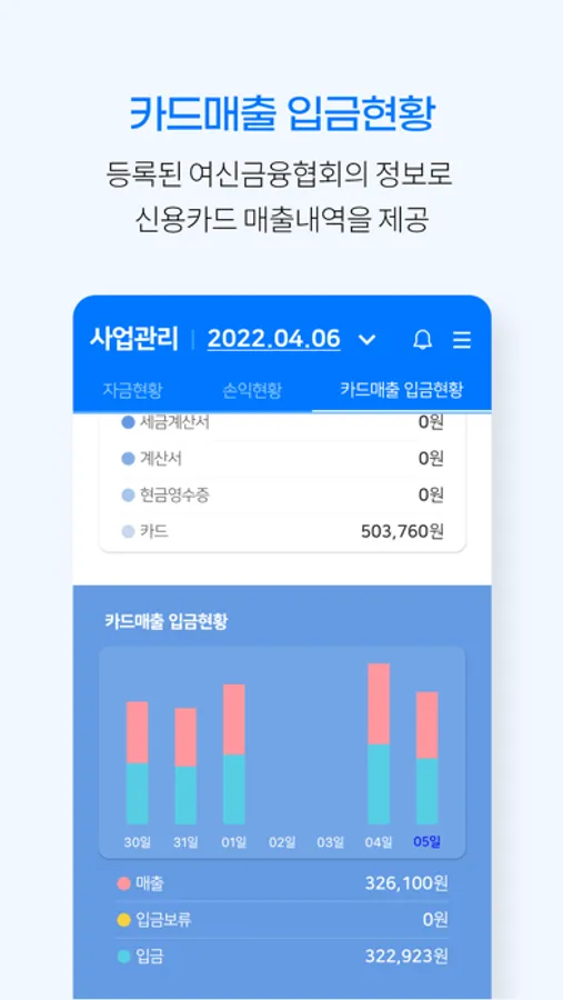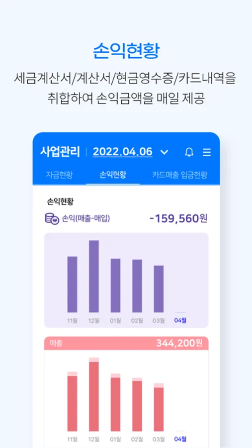 - 세금계산서 · 계산서 · 현금영수증 · 카드내역을 취합하여 손익금액을 매일 제공