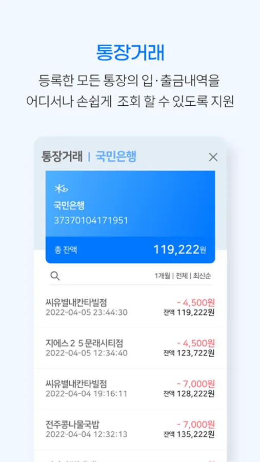 - 등록한 모든 통장의 입 · 출금내역을 어디서나 손쉽게 조회할 수 있도록 지원