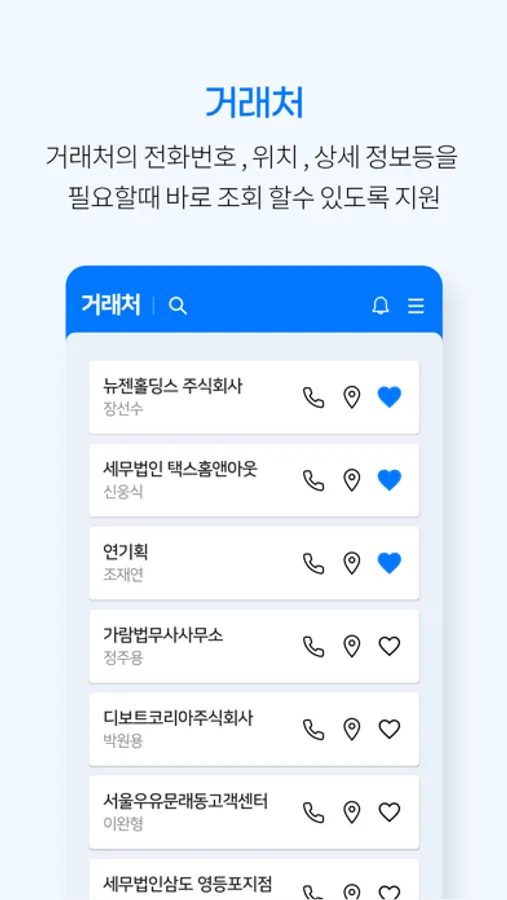 - 거래처의 전화번호, 위치, 상세 정보 등을 필요할때 바로 조회할 수 있도록 지원