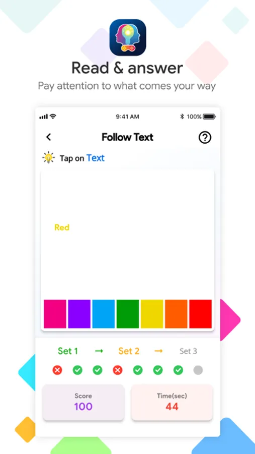 7. Follow Text = Enhance visual attention by hitting the correct colour according to text.