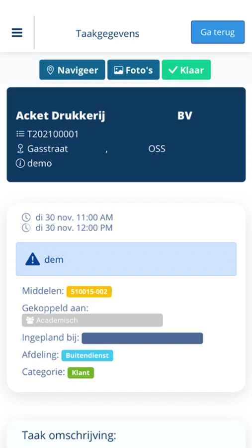 De Floow Taken app maakt het mogelijk om inzicht te krijgen op alle ingeplande taken en bijbehorende details. Zie onmiddellijk waar en hoe de taak uitgevoerd moet worden en welke uitrusting er nodig is. Wanneer de taken doormiddel van de app gecheckt worden, zullen deze meteen gesynchroniseerd worden met Floow web, zodat ieder een real-time overzicht heeft van alle taken