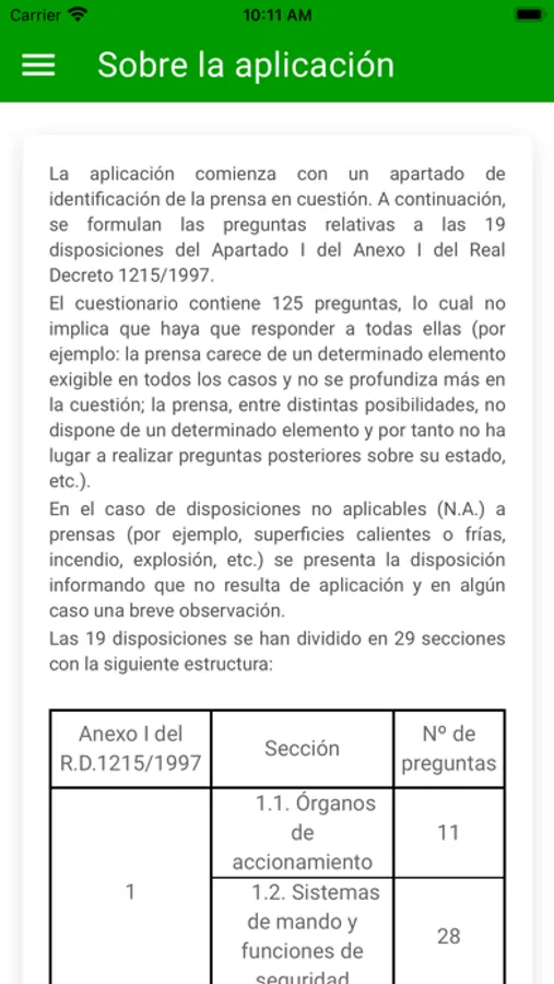 Comienza con un apartado de identificación de la prensa en cuestión. A continuación, se formulan las preguntas relativas a las 19 disposiciones del Apartado I del Anexo I del Real Decreto 1215/1997.