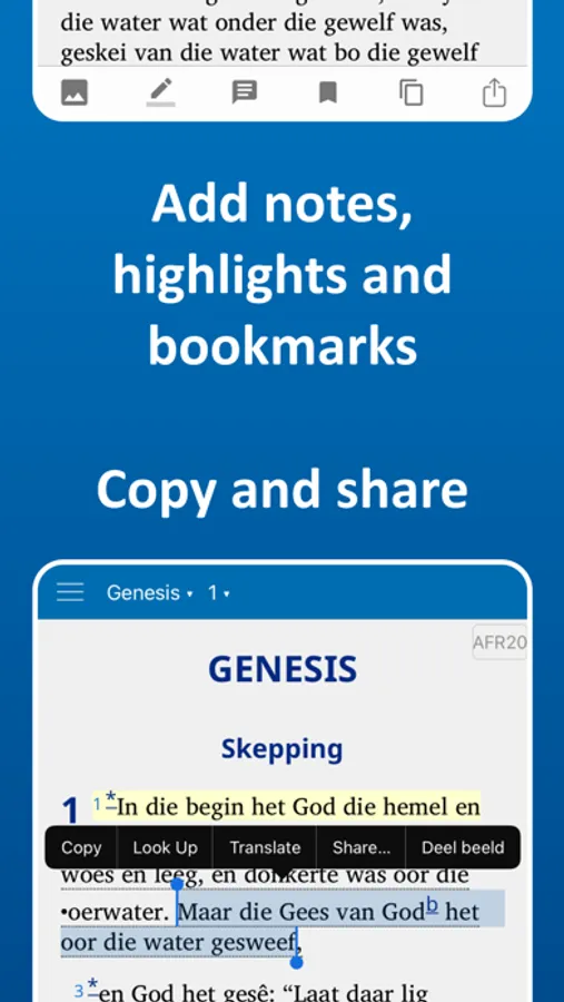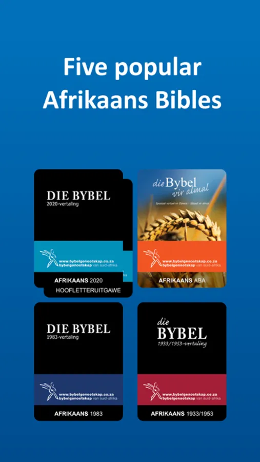 Download free Afrikaans Bibles to read offline. You can compare different translations, customise your Bible reading experience and copy or share Bible verses. Compact/light weight – (small file size).