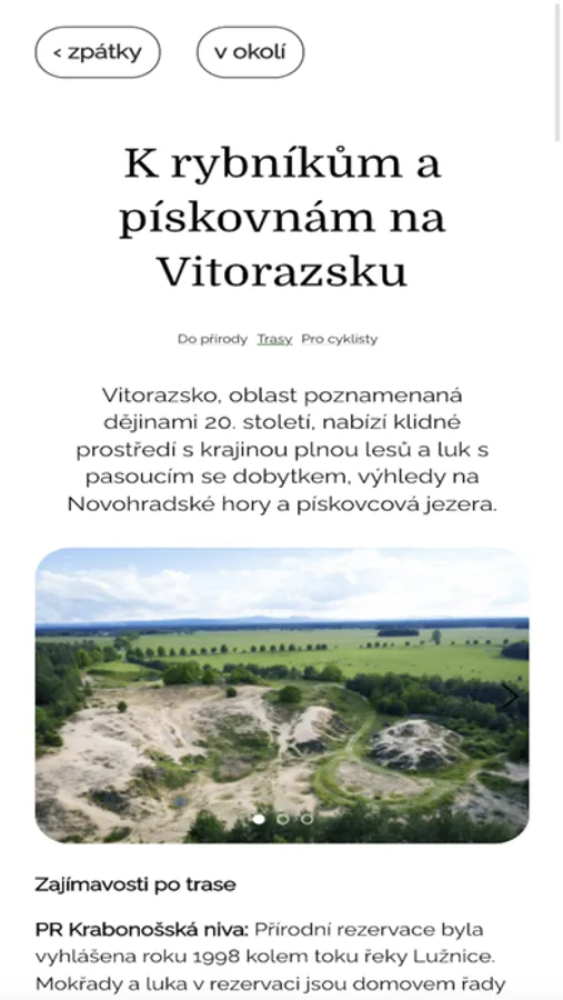 Mobilní průvodce vás provede turistickou oblastí Třeboňsko, která se rozprostírá na území od Českých Velenic na česko-rakouské hranici až po Veselí nad Lužnicí. V aplikaci najdete to nejlepší z celé oblasti: turistické cíle, výlety pro pěší i cyklisty či tipy, kde se najíst a ubytovat.