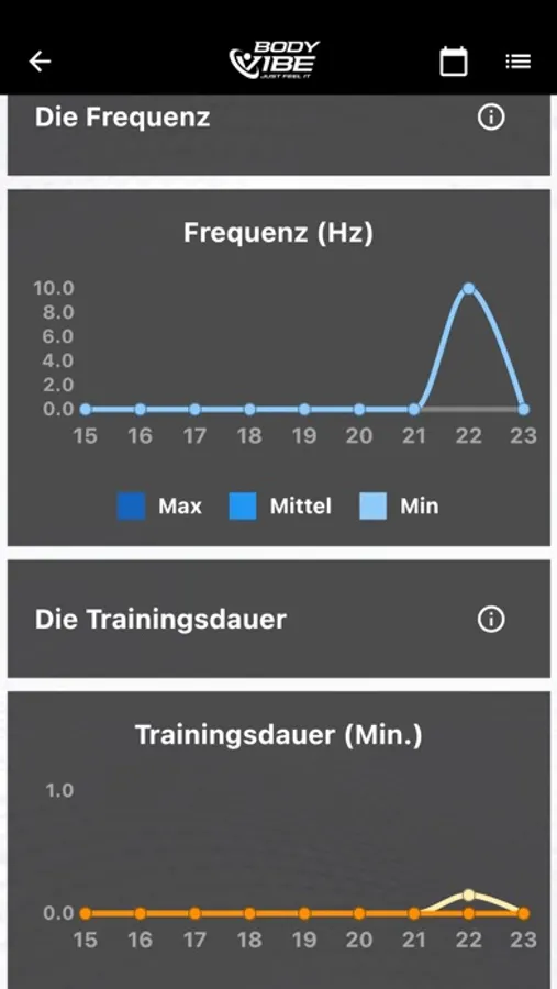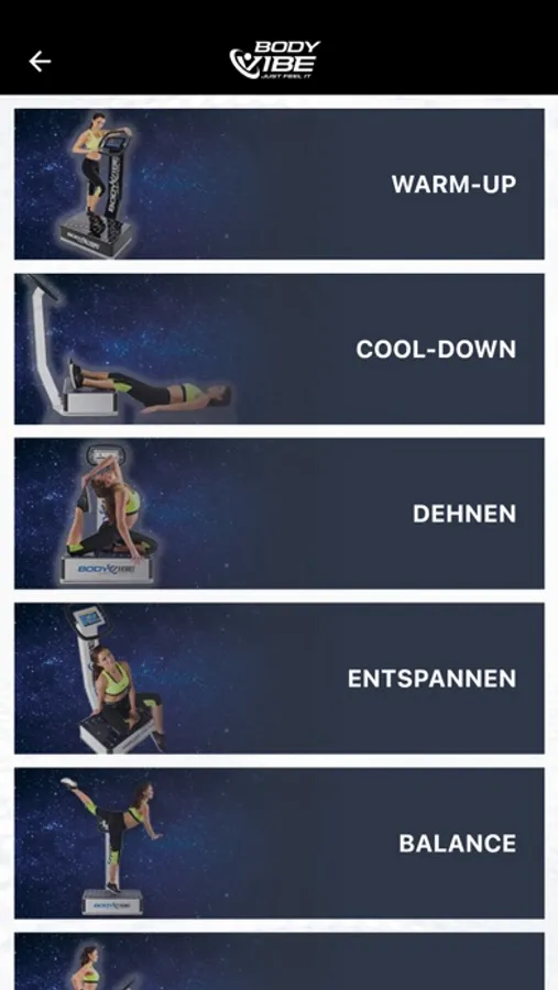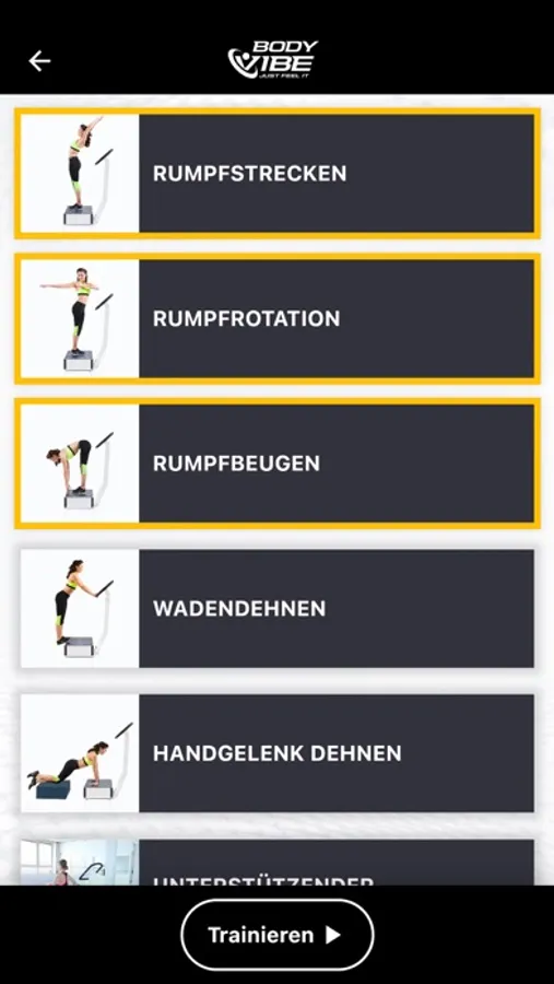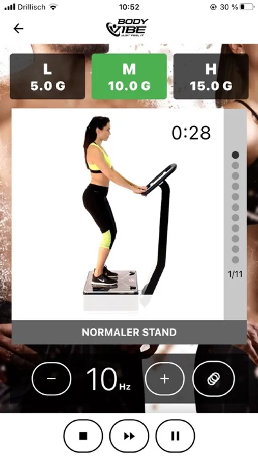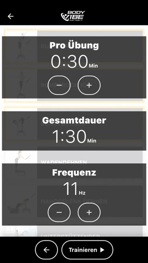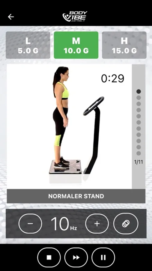 The BodyVibe VisualCoach is the professional control centre of your BodyVibe vibration trainer. The VisualCoach not only allows you to control your BodyVibe device through a manual mode, extensive training programmes, but also offers you numerous exercise videos and displays the important training values, such as frequency, time and live G-force. Optionally, the VisualCoach offers many more functions, such as additional training programmes and exercise videos, individual exercise combinations, the selection of muscle-specific exercises, a stochastic function (changing frequencies), statistics, a training plan manager for creating your own programmes and a multi-user mode. Three colour schemes are already available in the free version.