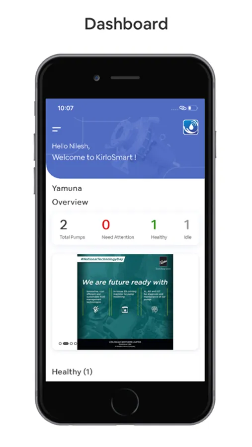 The intelligent IoT based KirloSmart technology helps the user to remotely and wirelessly monitor pump from the Smart devices, receive preventive and predictive maintenance alerts, spare notifications and carry out the analysis based on the historical trend.