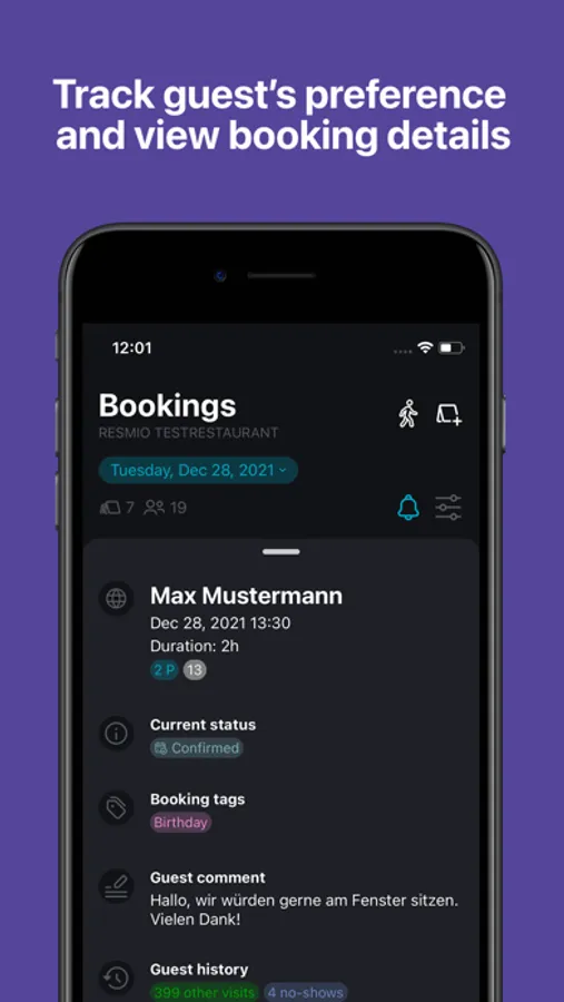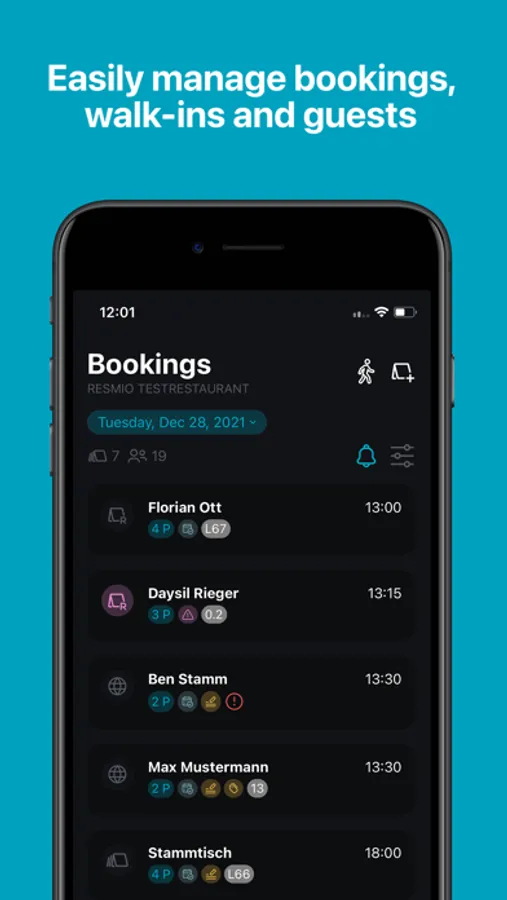 - Create reservations and walk-ins incl. booking tags (e.g. birthday, allergies), notes and tables