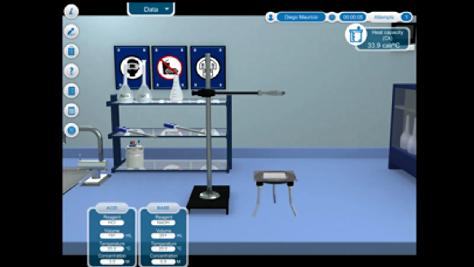In this practice, it is possible to measure the heat released by a neutralization reaction and to find its enthalpy. It is necessary to balance the energy of the acid and the base to an equilibrium point. To do so, the simulator recreates a laboratory with a calorimeter, a heating plate, a universal support, thermometers, a flask with an acid and a flask with a base (sodium hydroxide) as well as other materials and supplies to complete this practice.