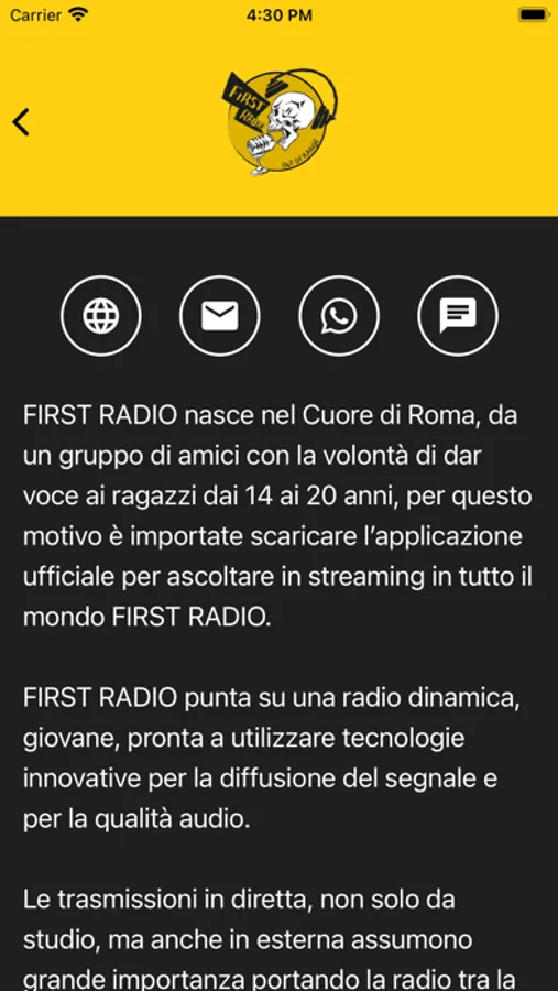 FIRST RADIO nasce nel Cuore di Roma, da un gruppo di amici con la volontà di dar voce ai ragazzi dai 14 ai 20 anni, per questo motivo è importate scaricare l’applicazione ufficiale per ascoltare in streaming in tutto il mondo FIRST RADIO.