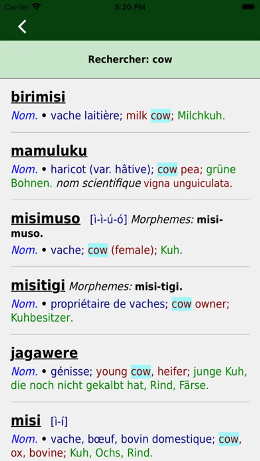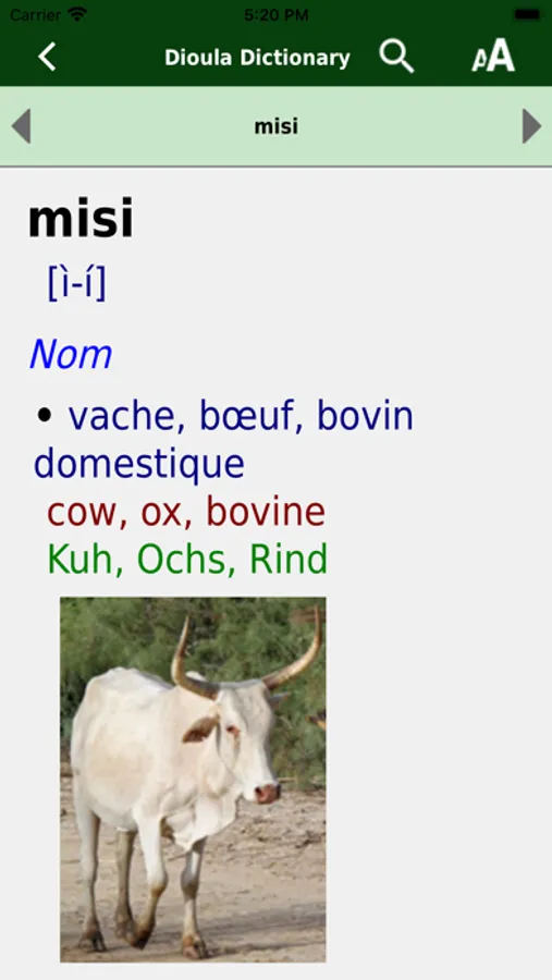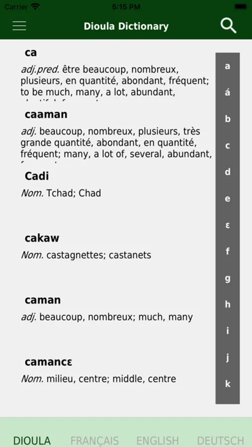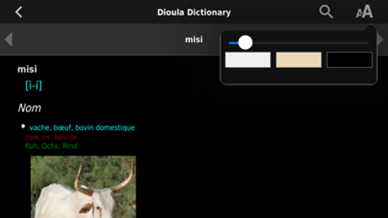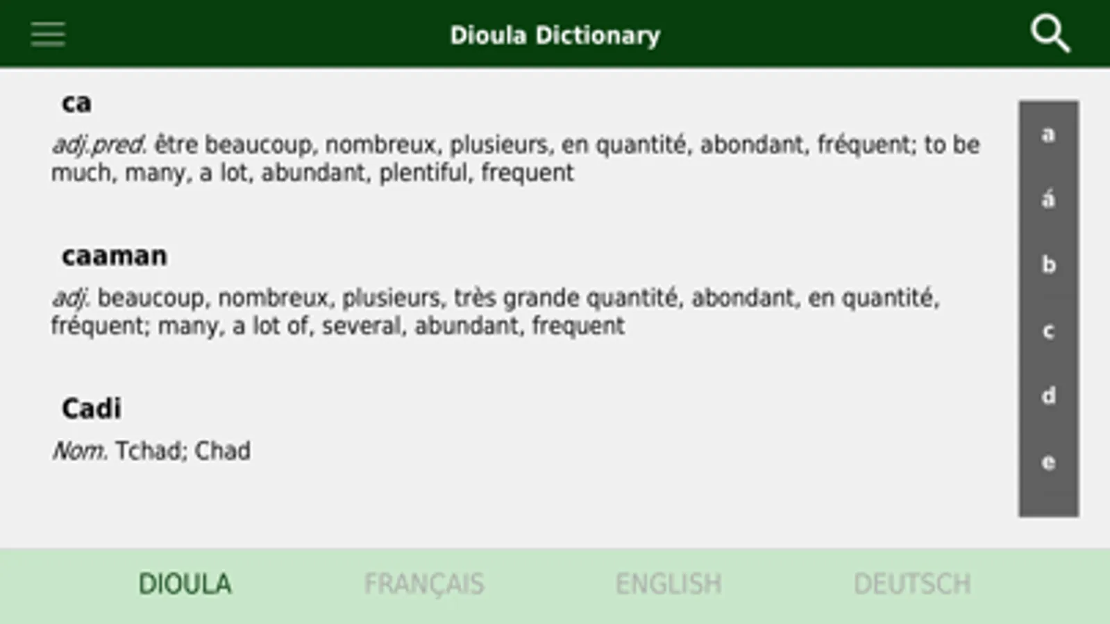 Dictionnaire trilingue Dioula - Francais - English - Allemand avec parfois des liens pour des synonymes, des phrases illustratives ou des images. Vous pouvez chercher des mots soit en tapant le mot recherche en moore soit en francais, soit en anglais. En cliquant sur la petite loupe en haut, vous pouvez écrire le mot que vous cherchez, soit vous écrivez en dioula à l’aide des caractères spéciaux affichés, soit vous écrivez le mot en français ou bien en anglais, ou bien en allemand. Ensuite tapez ‘’rechercher'' et vous verrez une nouvelle fenêtre ouverte qui montre soit une seule ou bien plusieurs entrées qui contiennent le mot recherché. Tapez sur le mot qui vous intéresse et une nouvelle fenêtre s’ouvrira. Si l’écriture vous semble trop petite, vous pouvez facilement l’agrandir avec vos doigts ou bien en cliquant dans le menu sur la fonction Taille de police.