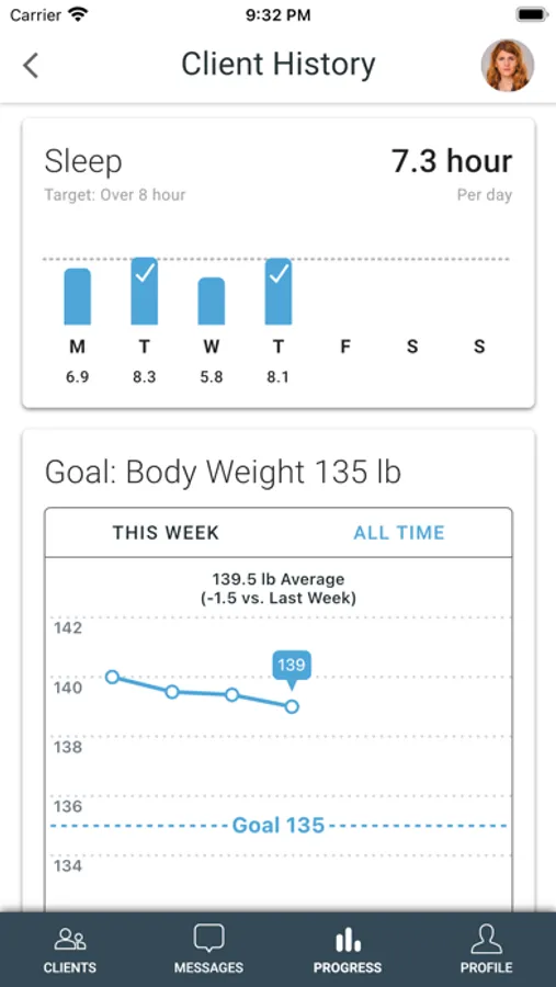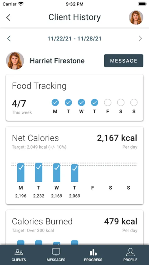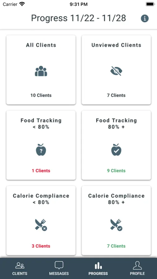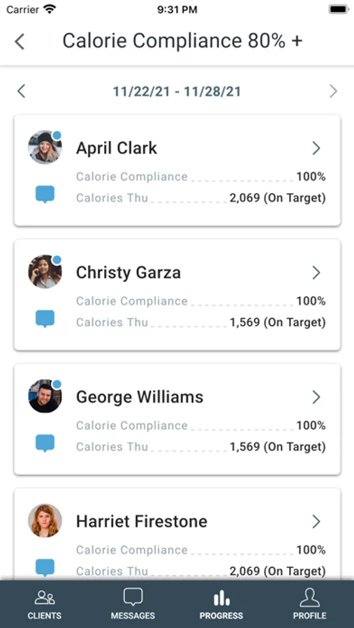 See a summary of weekly progress for all of your clients on one screen. Filter to see a list of clients with high compliance rates so you can congratulate them. Filter to see clients with lower compliance rates who may need some additional support. When needed, tap again to see a week by week history for each client.