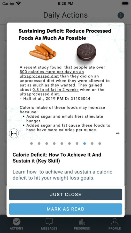 The coaching library is accessible from the messenger with a single tap and comes pre-loaded with evidence-based lessons on nutrition, exercise, sleep, and behavior change topics. Each lesson has been reviewed by an MD and PhD behavior change researcher. Lessons are based on studies from peer-reviewed journals, but are presented in an engaging format similar to Instagram.