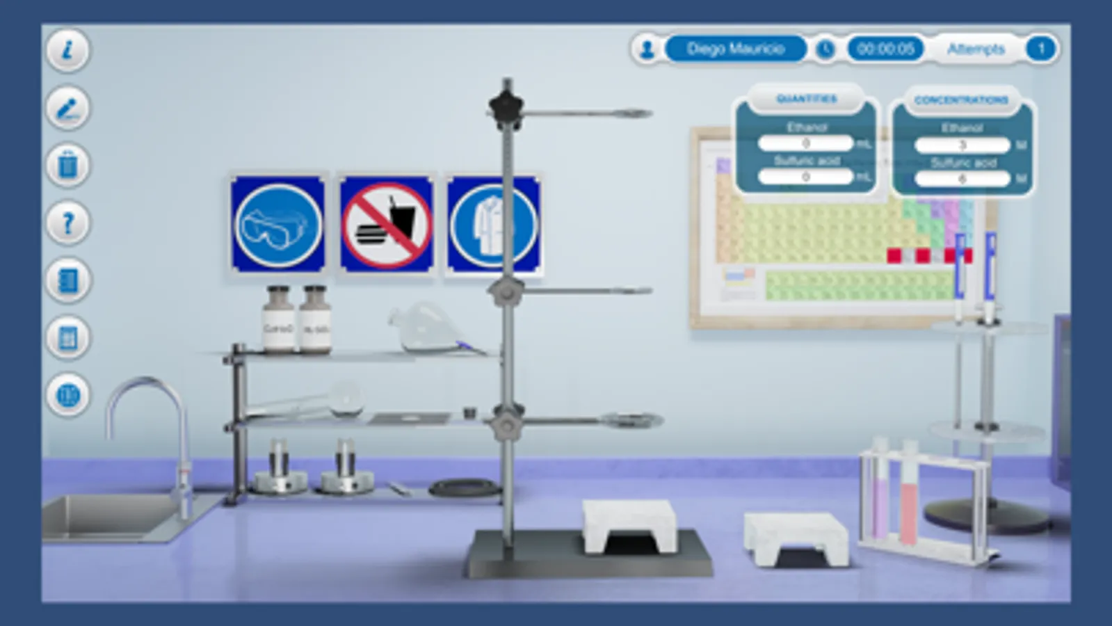 This simulator recreates a chemistry laboratory. It has a thermometer, a three-neck flask, a condenser, a heating plate, pipettes as well as other equipment and supplies to perform the synthesis of cyclopropane from ethanol, 1,3 dichloropropane and zinc.
