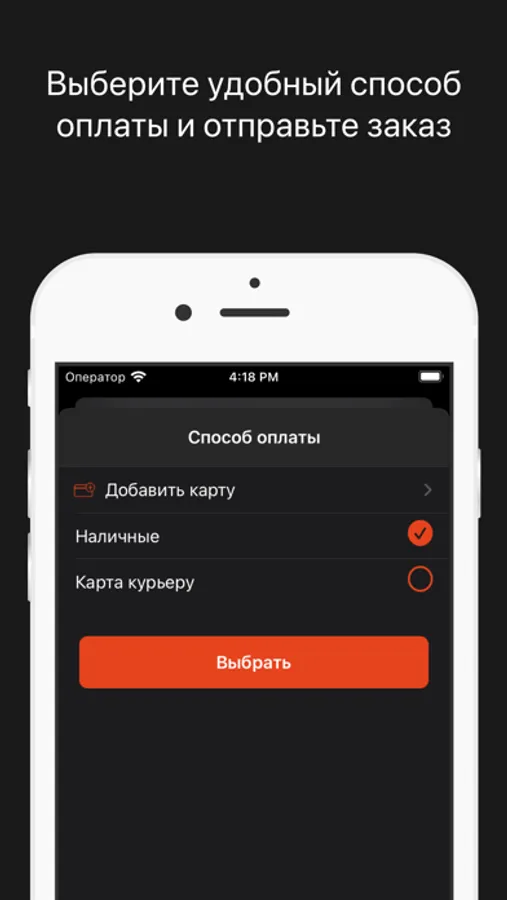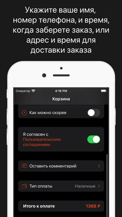 Укажите время, когда хотите прийти за своим заказом или выберите доставку с указанием времени и адреса доставки.