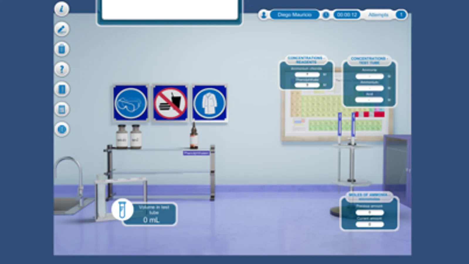 This simulator recreates a laboratory where you will find a bottle with ammonium, a bottle with ammonium chloride, a dropper with phenolphthalein and two pipettes. The objective of the practice is to find the equilibrium constant and determine the amount of ammonium chloride that is needed to have a given concentration of ammonia in solution.