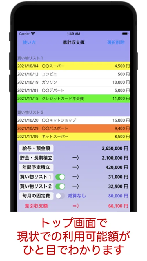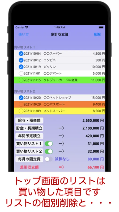 ・買い物リストは2つあります。(後払い用の買い物リストとして使用したり、自分の買い物、家族の買い物と分けて管理も可能)