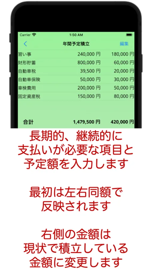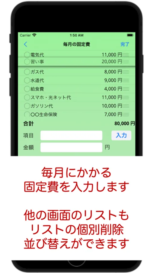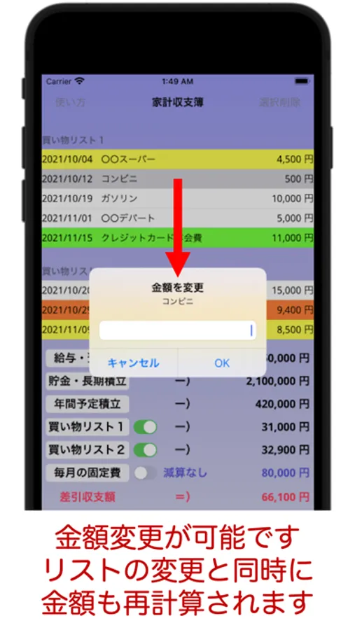 ・2と3の全てのリストで、項目の並べ替え、リストの項目をタップして金額の修正が可能です。