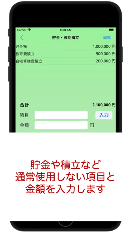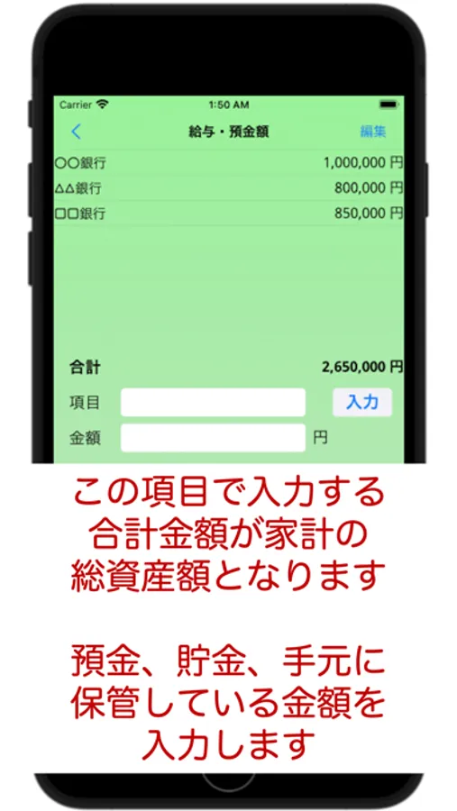 4.トップ画面の買い物リストと毎月の固定費の合計額は、総資産額から減算する・しないを選択可能です。