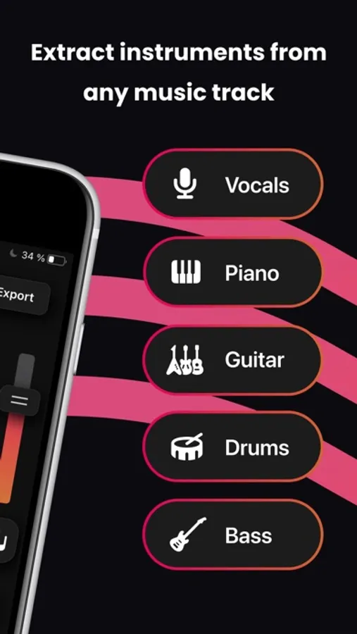 - Immediately extract and isolate all the instruments: vocals, guitar, piano, drums, bass