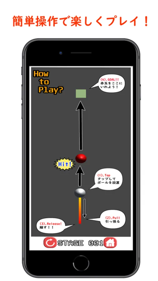 引っ張り加減と角度を上手く調整して、赤い玉を弾こう!!