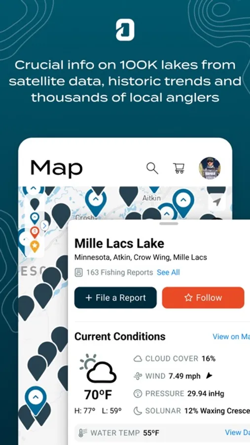 Tap into our database of 100,000 lakes across North America and get crucial info on water temps, clarity, depth contours, wind, weather and more.