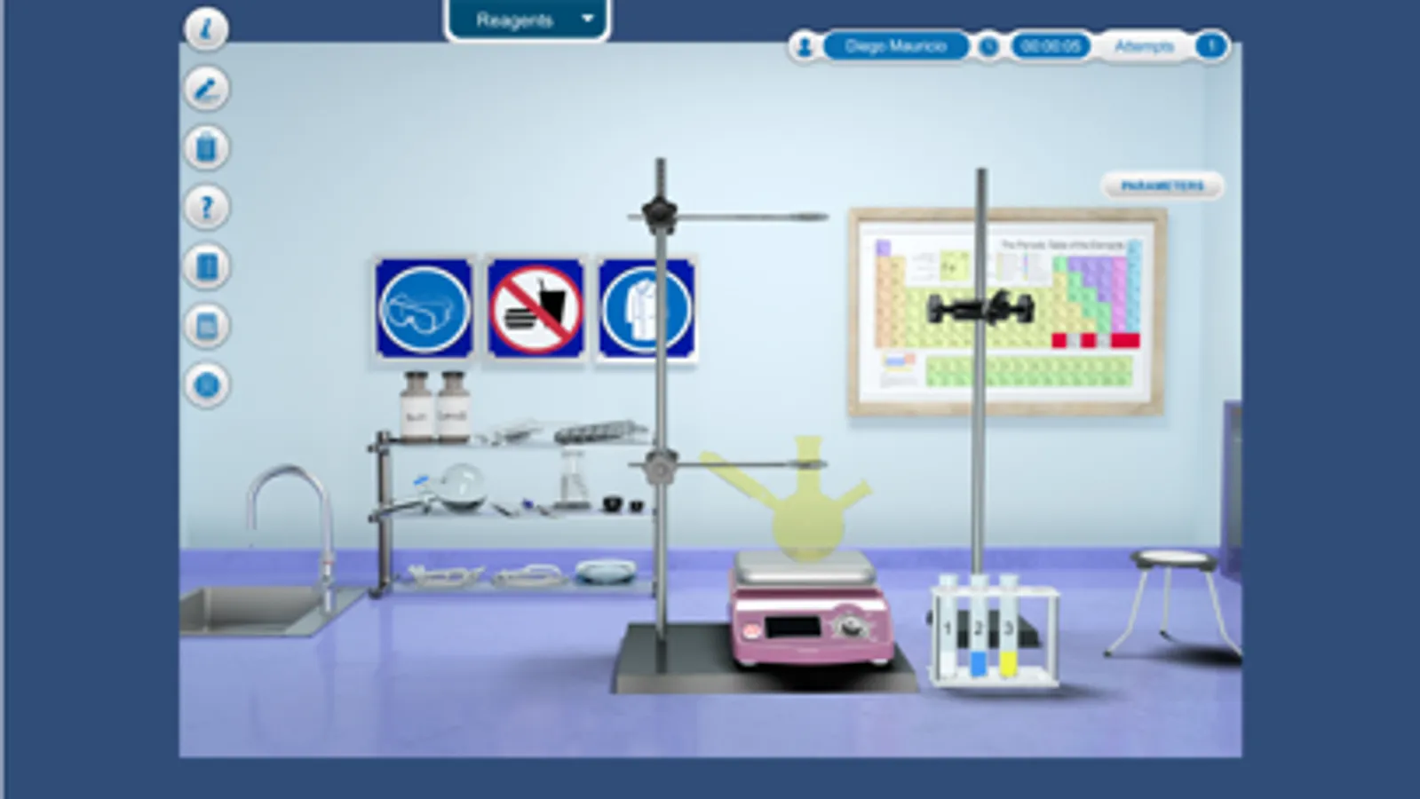 In this laboratory you will have a bottle with deionized water, a bottle with iron (II) nitrate, a bottle with potassium thiocyanate, a bottle with sodium hydroxide, two test tubes, a rack and four pipettors. The objective of the practice is to determine the amount of sodium hydroxide that can reduce the initially produced concentration of iron nitrate, potassium thiocyanate and water, in addition to finding the equilibrium constant of the reaction.
