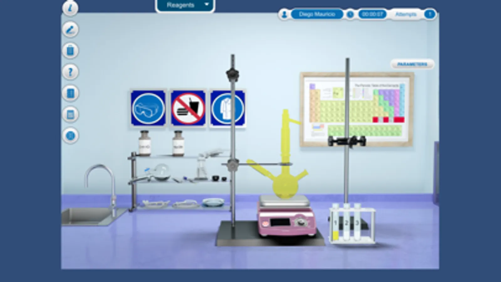 In this practice, it is possible to carry out the synthesis of benzyl alcohol to medicines production, from benzyl chloride and sodium hydroxide. The simulator recreates a chemistry laboratory with a thermometer, a triple mouth reaction balloon, a condenser, a crystallizer, a heating plate, a Lucas reagent, and a Jones reagent, among other instruments and supplies necessary to perform the synthesis.
