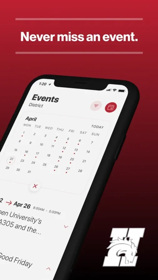The event section shows a list of events throughout the district. Users can add an event to their calendar to share the event with friends and family with one tap.