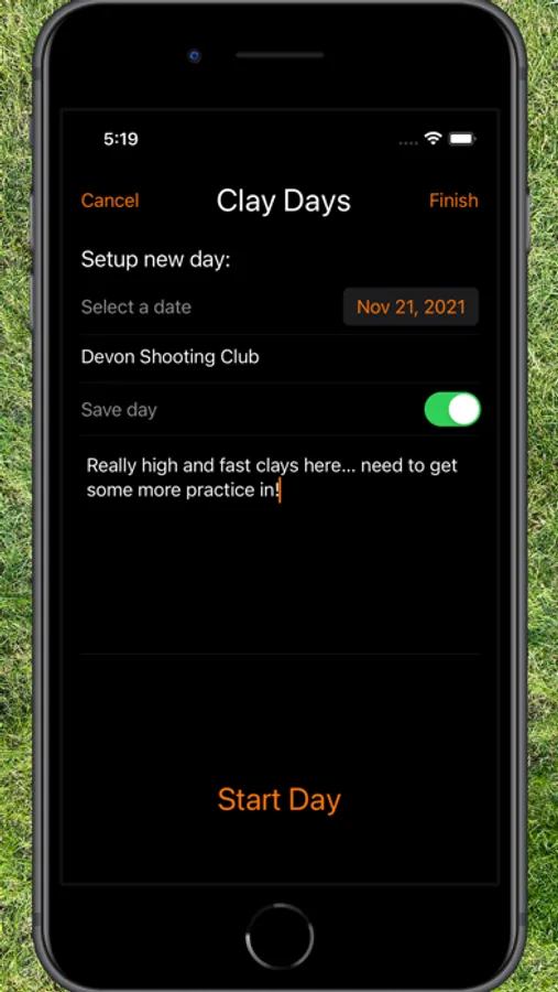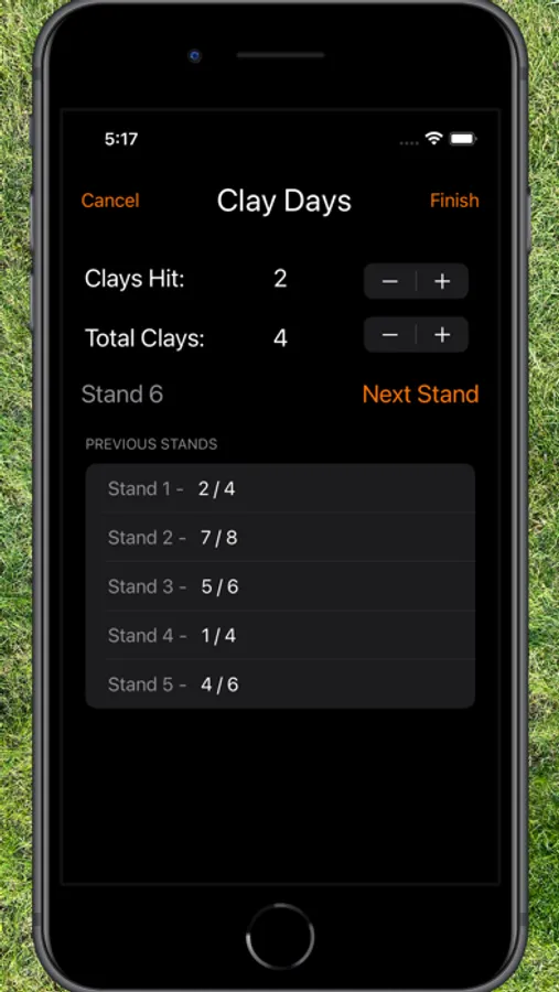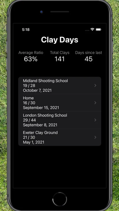 See your current ratio, and score when you're out. The home screen lets you keep track of your overall ratio, how long it has been since you last went, and how many clays you've hit ever. You can also look back at previous days and check your scores on the stands!